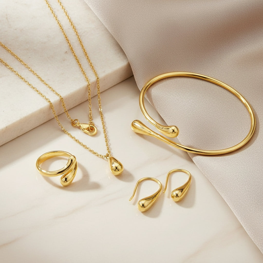 Ensemble Bijoux 4 Pièces Argent 925 Goutte d'Eau - Boucles d'Oreilles Bague Bracelet Collier Femme